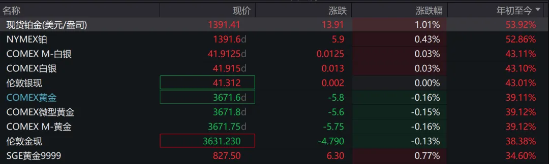 贵金属方面,截至7:45,COMEX黄金期货3671.6美元/盎司,COMEX白银期货报41.9美元/盎司。