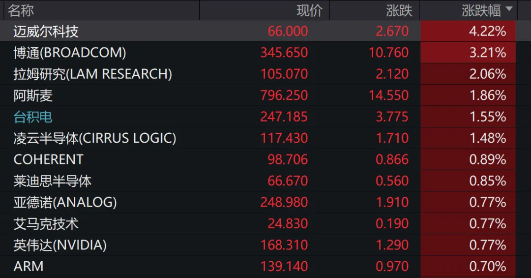 芯片股多数上涨,博通涨超3%,阿斯麦、台积电涨超1%,ARM小幅上涨,格芯跌超1%。