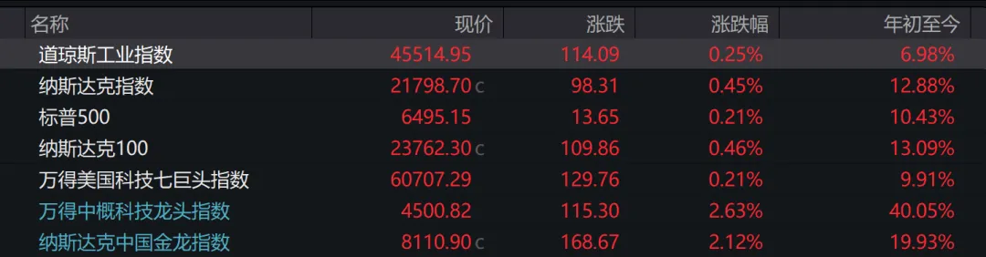 截至收盘,道琼斯工业指数收涨114.09点,涨幅0.25%,报45514.95点;纳斯达克指数收涨98.31点,涨幅0.45%,报21798.70点;标普500指数收涨13.65点,涨幅0.21%,报6495.15点。