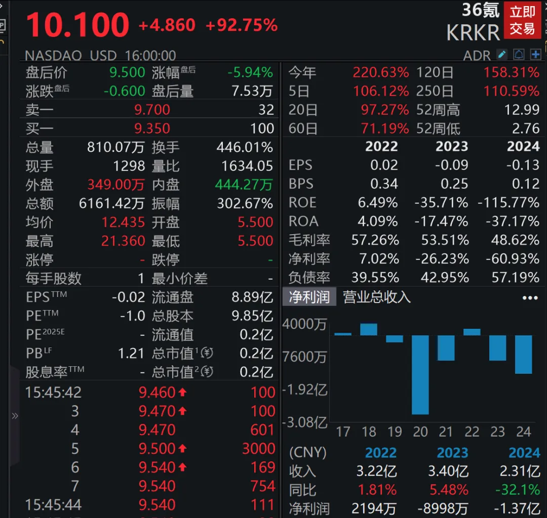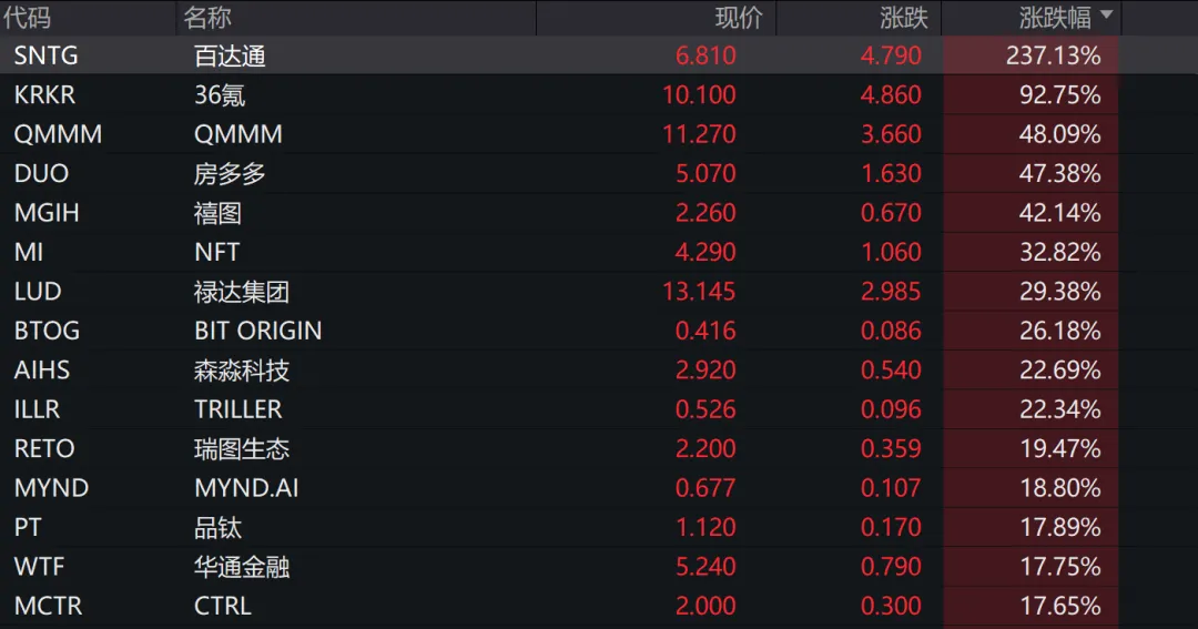 中国资产深夜爆发,热门中概股多数上涨,纳斯达克中国金龙指数收涨2.12%,年初以来该指数涨幅近20%。36氪盘中多次触发熔断,一度大涨307%,最终收涨近93%;多只中概股涨幅超10%,网易涨超7%,百度涨超6%,京东、阿里巴巴涨超4%,小鹏汽车、蔚来涨超3%,哔哩哔哩、理想汽车、拼多多小幅上涨。