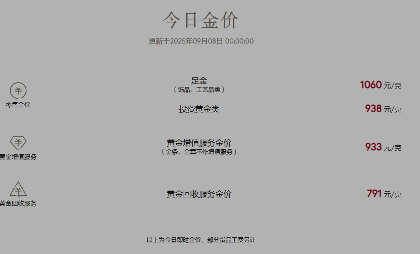 金价上涨效应传导至黄金消费市场,多个品牌金饰价格已经多日维持在每克千元的高位。9月8日,周大福、六福、潮宏基等品牌足金饰品均报价1060元/克,周生生足金饰品价格涨至1066元/克,老凤祥足金饰品价格涨至1063元/克。