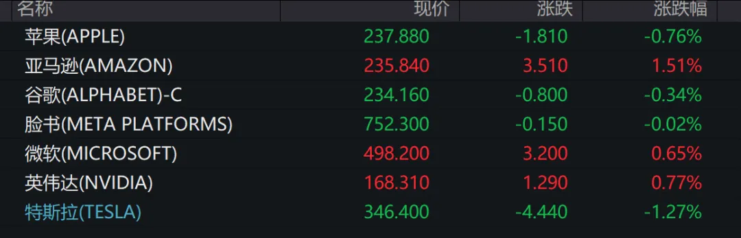 盘面上,大型科技股涨跌不一,亚马逊涨逾1%,英伟达涨0.77%,微软涨0.65%,脸书跌0.02%,谷歌跌0.32%,苹果跌0.76%,特斯拉跌逾1%。