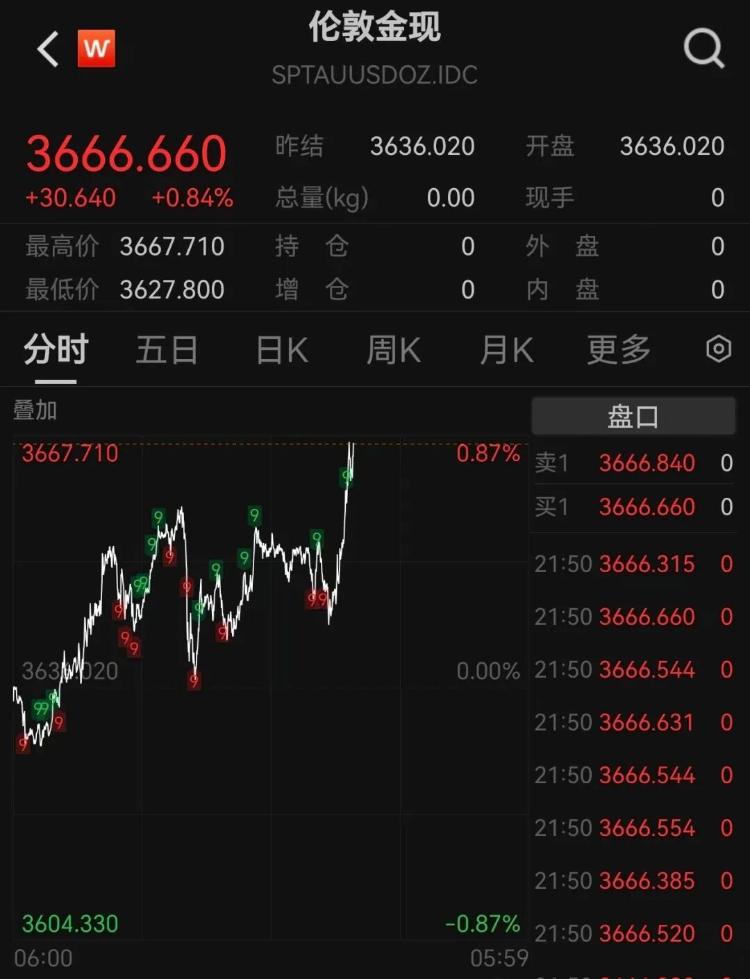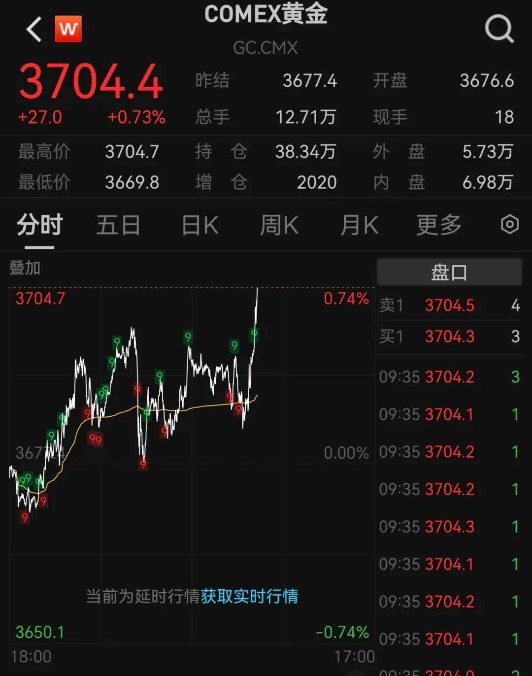 黄金再创历史新高, 截至21:50,现货黄金升破3660美元,COMEX黄金首次突破3700美元。