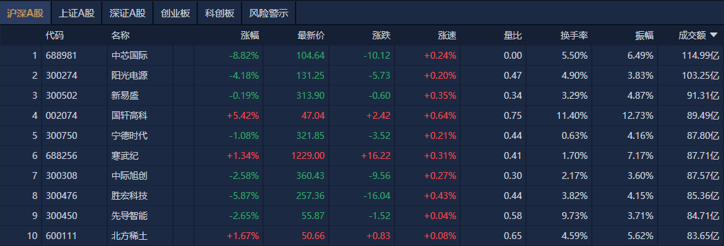 个股方面,中芯国际成交额超114亿元居首,阳光电源、新易盛、国轩高科成交额靠前。