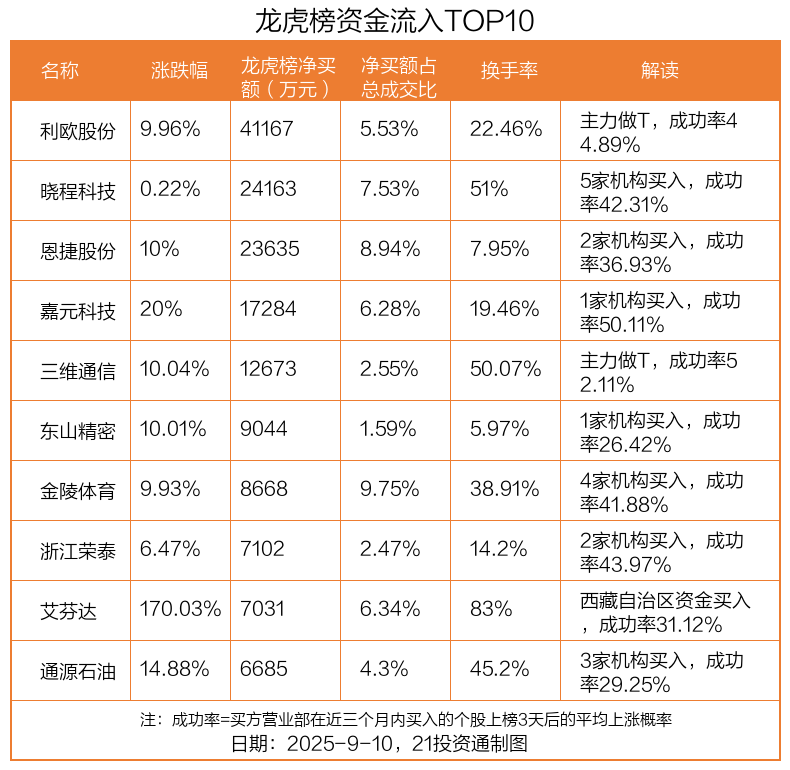 9月10日,上证指数上涨0.13%,深证成指上涨0.38%,创业板指上涨1.27%。盘后龙虎榜数据显示,共有43只个股因当日异动登上龙虎榜,资金净流入最多的是利欧股份(002131.SZ),达4.12亿元。