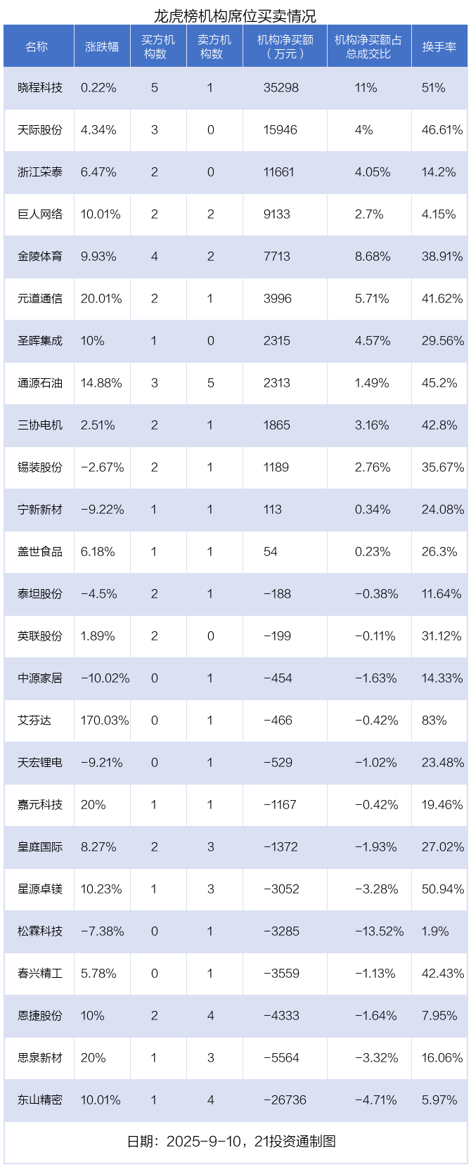 9月10日,25只个股龙虎榜出现了机构的身影,机构合计净买入4.07亿元。具体来看,机构净买入12股,净卖出13股。