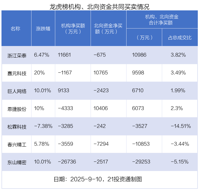 值得注意的是,机构和北向资金共同净卖出了松霖科技、东山精密、春兴精工;在嘉元科技,恩捷股份,浙江荣泰,巨人网络上出现分歧,机构净卖出嘉元科技1167.15万元,北向资金净买入1.08亿元;机构净卖出恩捷股份4333.1万元,北向资金净买入1.04亿元;机构净买入浙江荣泰1.17亿元,北向资金净卖出674.53万元;机构净买入巨人网络9132.62万元,北向资金净卖出2422.64万元。