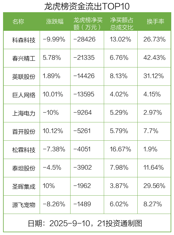 而龙虎榜中资金净流出最多的是科森科技(603626.SH),被净卖出为2.84亿元,占总成交金额的13.02%。科森科技收盘下跌9.99%,换手率为26.73%。