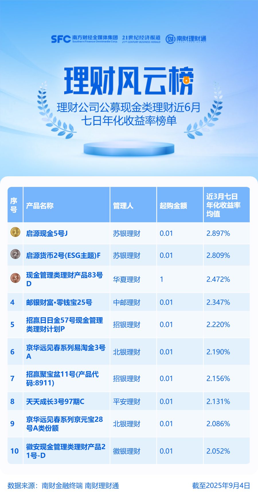 产品统计范围为理财公司发行的公募现金类产品,统计截止日期为2025年9月4日,统计区间为近6个月。