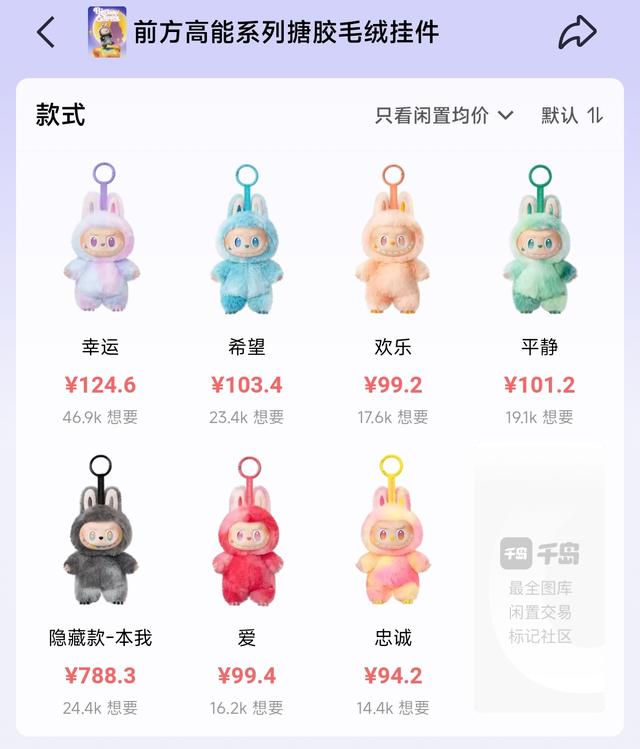 以当前最热门的产品、2025年新上线的第三代Labubu“前方高能系列”为例,这套产品包含1个隐藏款和6个常规款,单个原价99元。据《科创板日报》统计,其常规款在二手市场上的均价区间在90-130元之间,甚至有一款的交易均价掉到了原价之下。