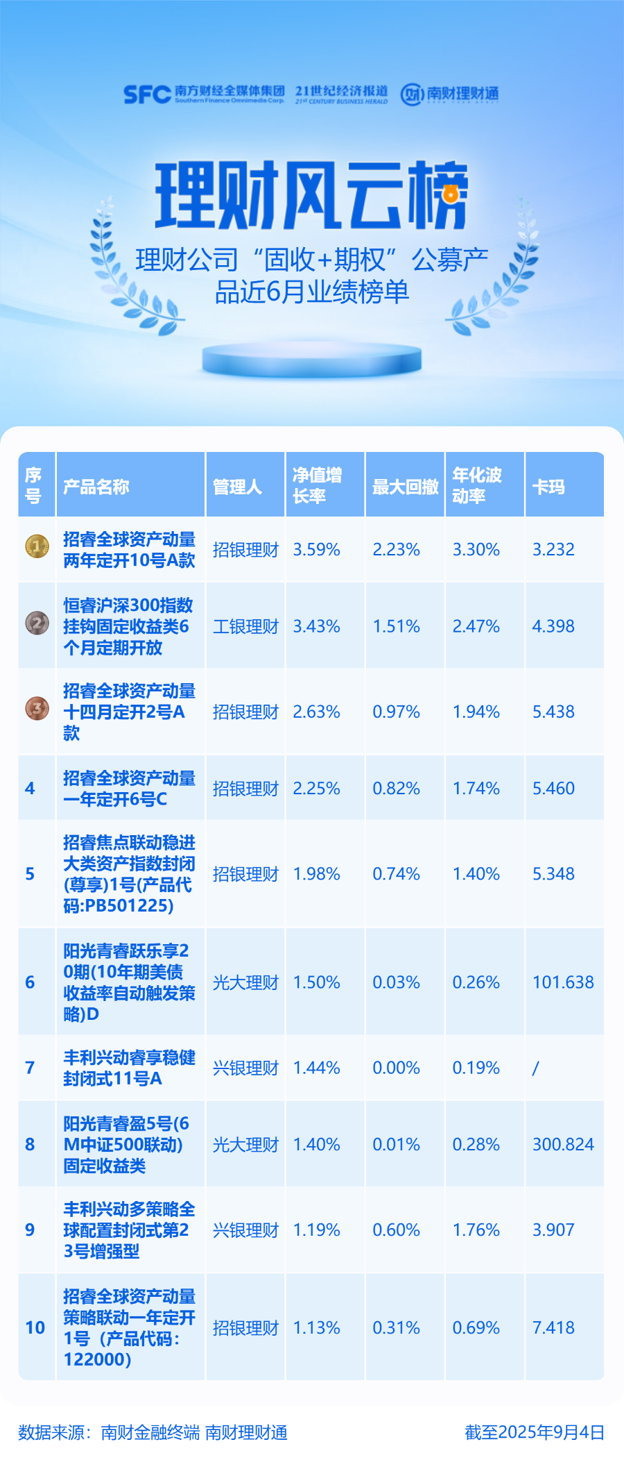 产品统计范围为理财公司发行的公募“固收+期权”理财产品,统计截止日期为2025年9月4日,统计区间为近6个月。