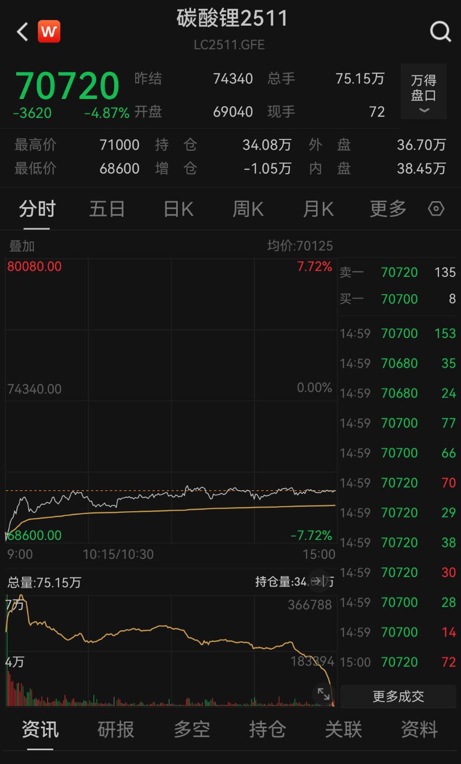 9月10日,国内碳酸锂期货市场遭遇重挫。主力合约(2511)以6.9万元/吨开盘,距6.84万元/吨跌停价仅一步之遥,最终收跌4.87%至7.07万元/吨。碳酸锂其他合约价格亦同步大幅下挫。
