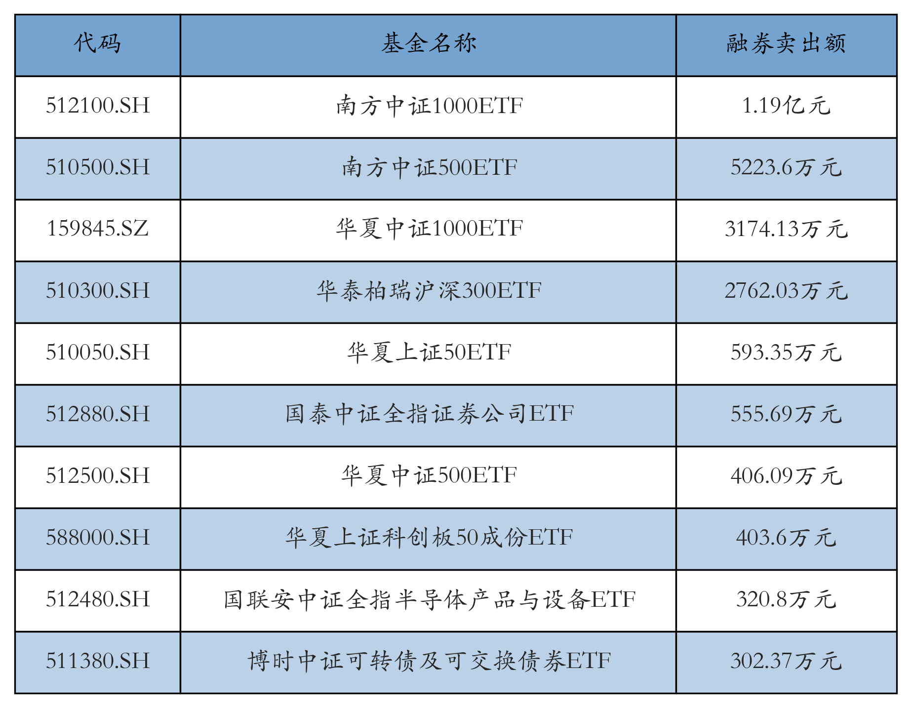9月9日ETF融券卖出额前三位分别为:南方中证1000ETF(1.19亿元)、南方中证500ETF(5223.6万元)和华夏中证1000ETF(3174.13万元),前10具体见下表: