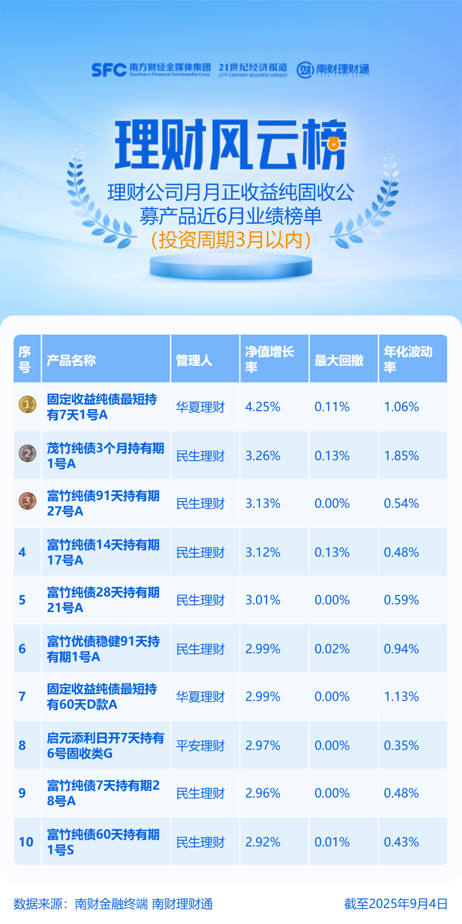 产品统计范围为理财公司发行的投资周期在3月以内(含)的公募纯固收产品,且近1年每个完整的自然月月末均为正收益。产品统计截止日期为2025年9月4日,统计区间为近6月。