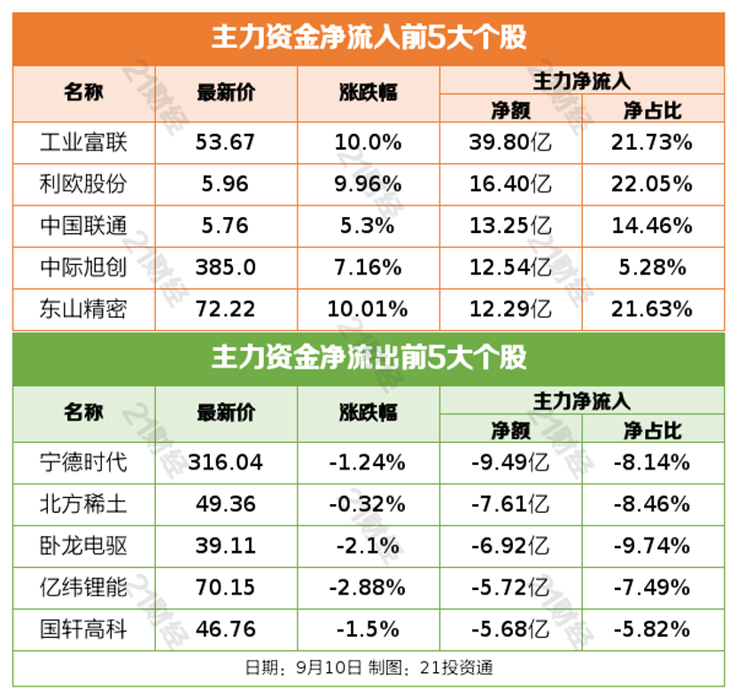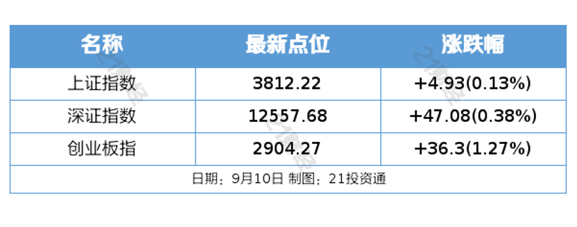 9月10日,市场震荡拉升,三大指数盘中出现冲高回落后再反弹。截至收盘,沪指涨0.13%,深成指涨0.38%,创业板指涨1.27%。沪深两市成交额1.98万亿,较上一个交易日缩量1404亿。