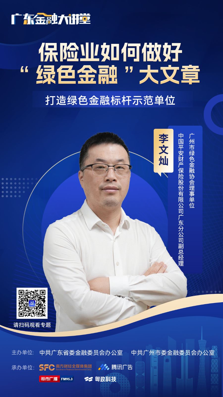 主持人:解读金融政策、普及金融知识、防范金融风险。大家好,欢迎来到由中共广东省委金融委员会办公室、中共广州市委金融委员会办公室主办的《广东金融大讲堂》。我们接下来将进入到的是做好绿色金融大文章的专题当中。打造绿色金融标杆示范单位,服务美丽广州建设,擦亮绿色金融名片。本期节目,我们将会邀请到广州市绿色金融协会理事单位:中国平安财产保险股份有限公司广东分公司副总经理李文灿,李总来做客,与大家畅聊保险业如何做好“绿色金融”大文章,助力美丽广州建设。您好,李总。