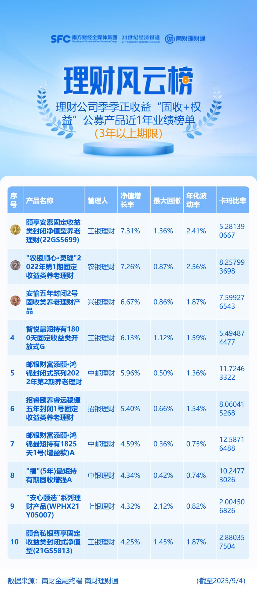 “固收+权益”产品范围为理财公司发行的投资周期在3年以上(含)的公募“固收+权益”产品,且近1年每个完整的自然季季末均为正收益,统计截止日期为2025年9月4日,统计区间为近1年。