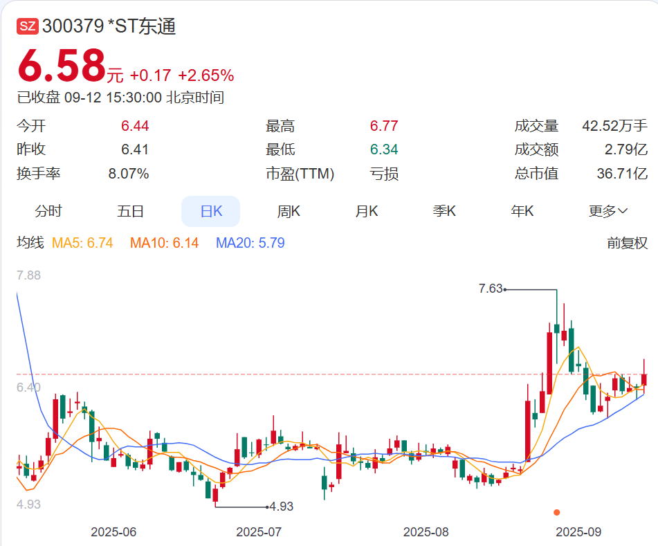 截至9月12日收盘,*ST东通股价报收6.58元,年内跌超56%,总市值36.71亿元。