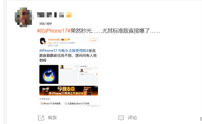 北京时间9月12日晚8点,iPhone 17系列正式开启预售,在官方AppleStore渠道,不管是App还是网页都出现了卡在“欢迎页面”的情况。“苹果官网进不去”、“iPhone 17抢不到”冲上微博热搜。