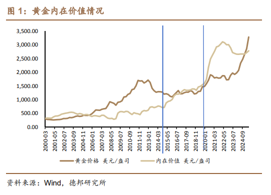 金价与利率相关性的背后是美元币值稳定性的影响。金价的影响因素更多来自美元总量,基于我们对金价周期的划分以及对黄金内在价值的测算,可以看到在2003-2015年,即利率金价相关性较强的阶段中,黄金的内在价值基本稳定,其内在逻辑为美元的币值基本稳定,因此在此阶段中,金价与利率表现出了更好的相关性。而在此之后的2016-2019年,金价与内在价值大致重合;2020年至今,受前期美联储货币政策收紧影响,一方面内在价值在逐步回收,另一方面是金价在加息的背景下受美元信用推动缓步上涨,直至2024年货币政策转向一举追平内在价值。
