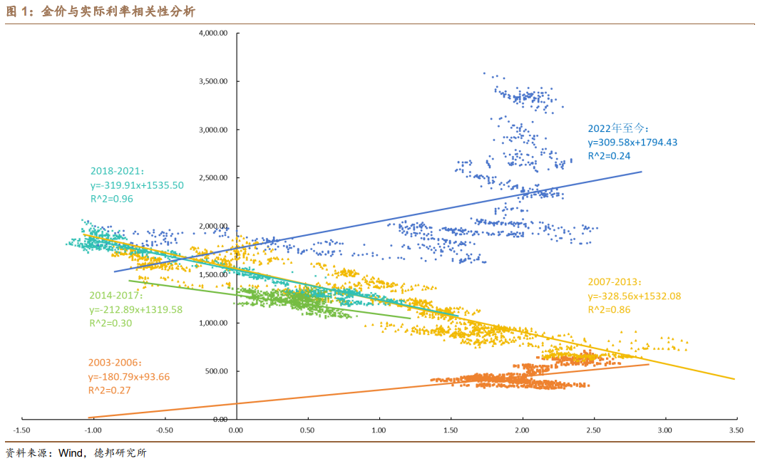 表面观测,金价与美元实际利率在过去的20余年里相关性有所波动。通过对金价以及美元实际利率的回归,可以看到:2003年-2015年间,金价对美元实际利率的敏感度为-404.8,解释力度为0.75;2016年-2019年间,金价对美元实际利率的敏感度为-151.3,解释力度为0.24;2020年至今,金价对美元实际利率的敏感度为224.1,解释力度为0.36。一方面是美元实际利率对金价的解释力度有所下滑,另一方面是在2020年至今这一区间中金价对美元实际利率出现了反直觉的正相关。二者均体现了金价在直接数据层面出现了与利率的脱钩。