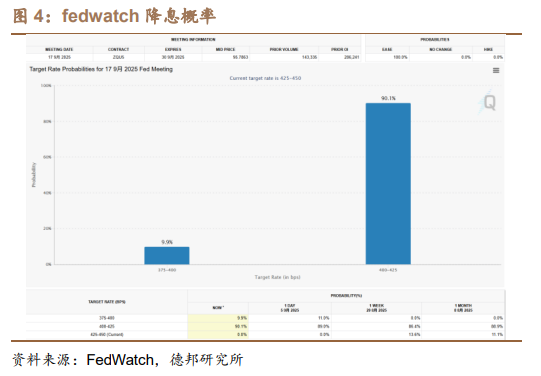8月非农数据不及预期,带动降息预期提升。8月非农就业人口增加 2.2万人。8月失业率 4.3%。此外,就业报告将6月份的新增就业人数从此前的增加2.7万人大幅下修为减少1.3万人,这是自2020年以来,美国月度就业人数首次录得负增长。就业报告公布后,9月降息50个基点的选项摆上了台面。截至9月8日,根据FedWatch数据,当前美联储9月降息一次概率为90.1%,降息两次概率为9.9%;截至年底,美联储降息三次概率最大,为68.6%。伴随美联储降息过程持续,我们持续看好金价表现。