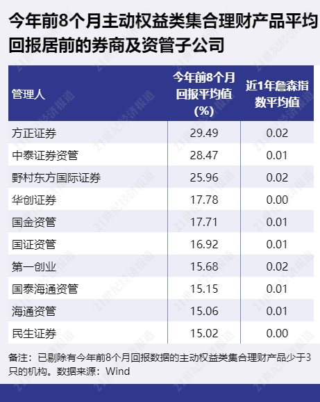 主动权益类产品整体表现不错,有3家券商及资管子公司的主动权益类集合理财产品前8个月平均回报已超20%,分别为方正证券29.49%、中泰证券资管28.47%、野村东方国际证券25.96%。