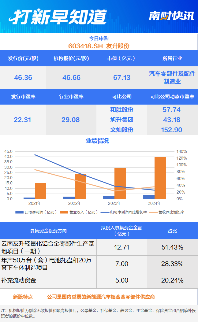 9月12日,可申购上交所主板的友升股份(603418.SH)。该公司是集设计、开发、生产、销售、服务于一体的专业铝合金汽车零部件制造商,专注于轻量化汽车零部件领域;产品主要聚焦于新能源汽车领域,已经形成了门槛梁系列、电池托盘系列、保险杠系列、副车架系列等多产品体系。