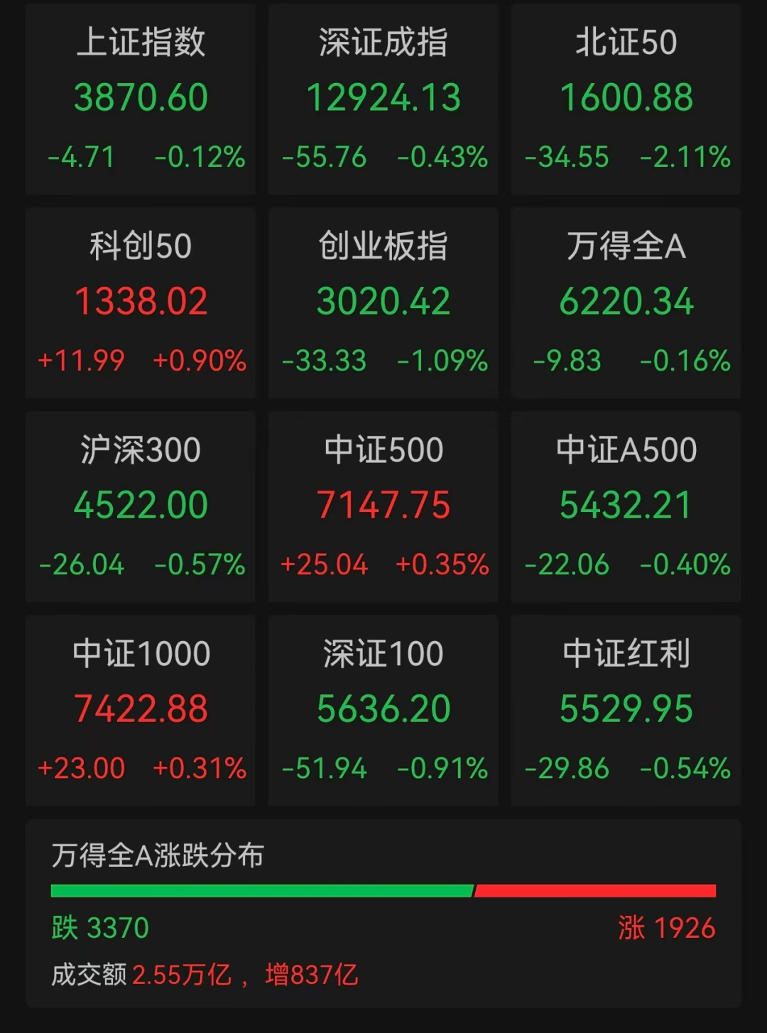 9月12日,A股三大指数冲高回落,集体收跌。沪深两市成交额2.52万亿,较上一个交易日放量837亿元,全市场3370只个股下跌。