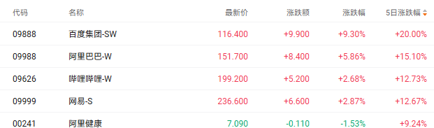 本周百度、阿里、哔哩哔哩、网易等港股累计涨幅均超10%。