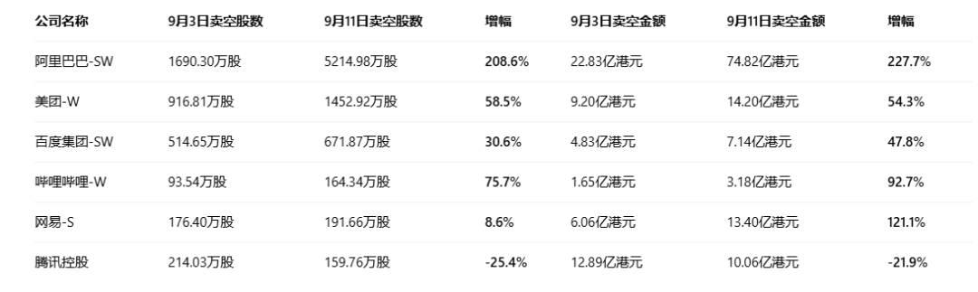 但要注意的是,根据港交所最新披露的数据,9月3日至11日期间,部分科技公司卖空量呈现倍数级增长,其中阿里巴巴的卖空股数增超208%,同期卖空金额增近228%。