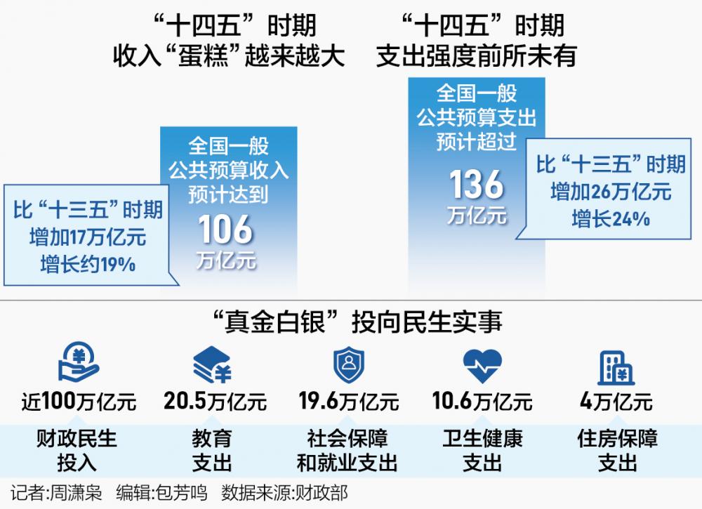 “十四五”时期,全国一般公共预算收入预计达到106万亿元,比“十三五”时期增加17万亿元,增长约19%;全国一般公共预算支出预计超过136万亿元,比“十三五”时期增加26万亿元,增长24%。