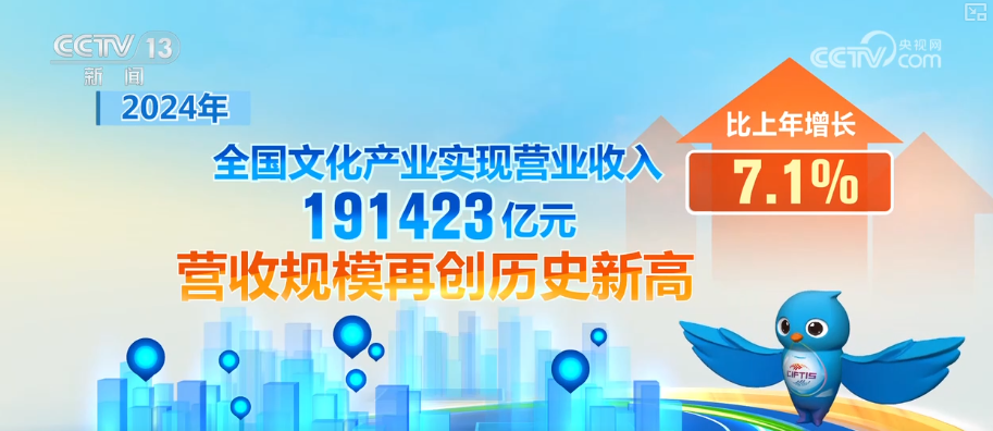 2024年,全国文化产业实现营业收入191423亿元,营收规模再创历史新高,比上年增长7.1%。2024年,文化服务业实现营业收入109134亿元,比上年增长7.4%,占全部文化产业营业收入的比重为57.0%,文化服务业对文化产业营业收入增长的贡献率为59.1%。