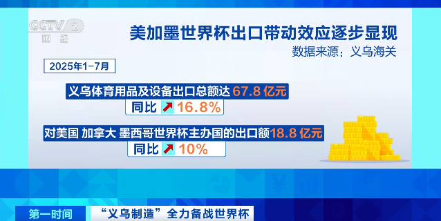 距离2026年美加墨世界杯开幕还有9个月,作为“世界超市”的义乌已率先驶入世界杯经济“快车道”。记者了解到,今年前7个月,义乌体育用品对美国、加拿大、墨西哥的出口额增长显著。