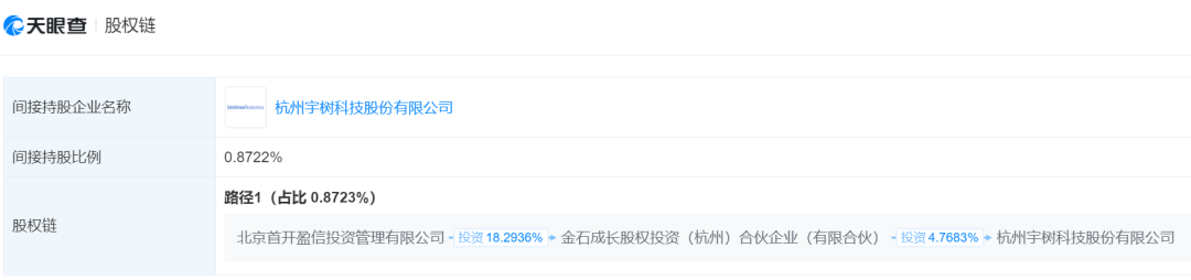 另据天眼查显示,首开股份旗下控股子公司北京首开盈信投资管理有限公司(下称“盈信公司”)通过所投资的金石成长股权投资(杭州)合伙企业(有限合伙)(下称“金石成长基金”)间接持有杭州宇树科技股份有限公司(下称“宇树科技”)0.8722%的股份。