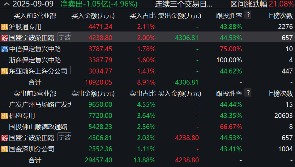 Wind龙虎榜数据显示,上榜营业部席位9月5日至9日连续三个交易日合计净卖出1.05亿元。具体来看,沪股通专用、国盛证券宁波桑田路证券营业部分别买入4471.24万元、4238.8万元;广发证券股份有限公司广州马场路广发证券大厦证券营业部、机构专用分别卖出9650万元、7720万元。