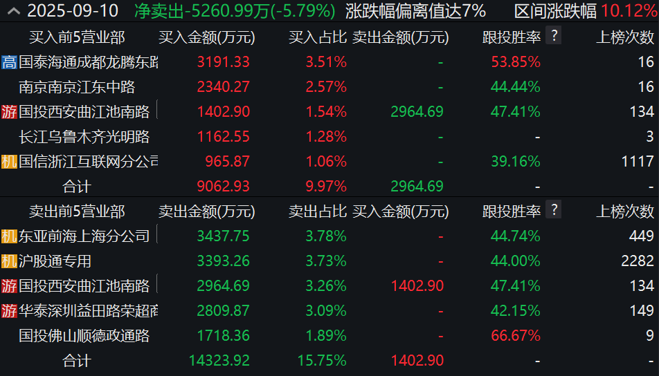 时代财经注意到,据Wind显示,不久前上榜买入席位的沪股通专用在9月10日选择大举卖出,实现部分的“快进快出”。