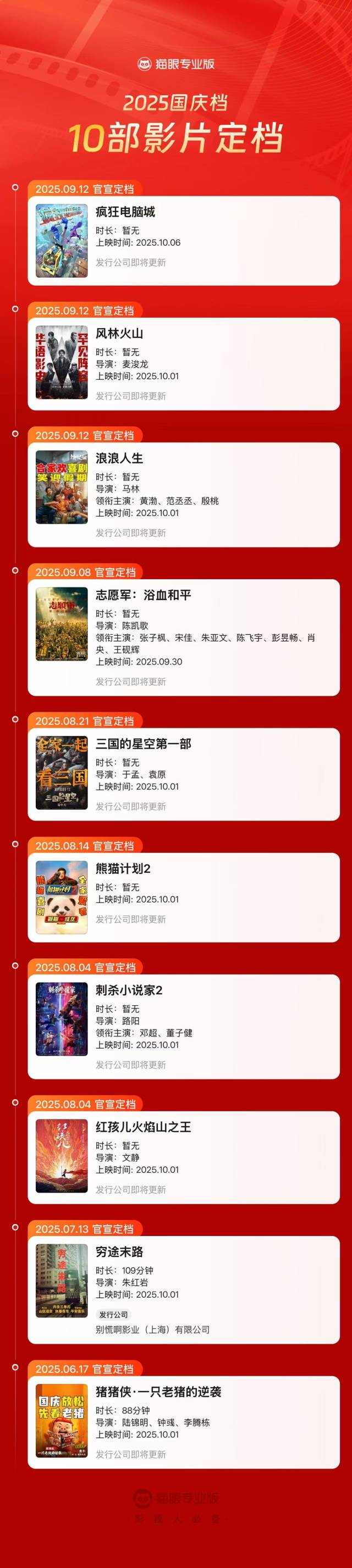 而即将到来的国庆档,目前已有10部新片定档,其中《志愿军:浴血和平》《风林火山》《刺杀小说家2》《熊猫计划2》等影片较受关注。