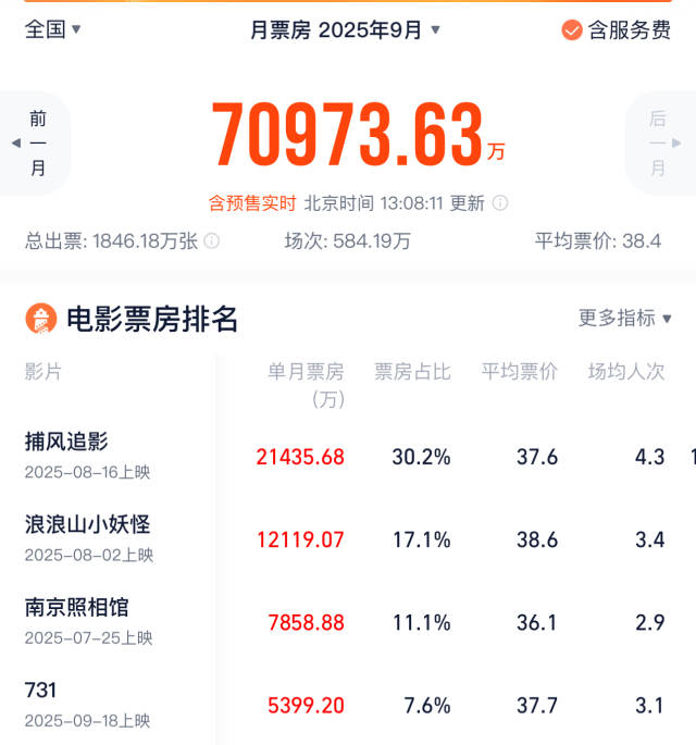 其中,9月全国票房已突破7亿元,暑期档影片《捕风追影》《浪浪山小妖怪》《南京照相馆》目前仍分列9月票房榜前三名。即将于9月18日正式上映的《731》预售票房已突破5000万元,上映首日全国排片占比高达96.7%,有望后来居上,拿下9月票房冠军。