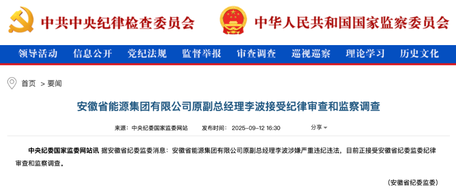 据安徽省纪委监委消息:安徽省能源集团有限公司原副总经理李波涉嫌严重违纪违法,目前正接受安徽省纪委监委纪律审查和监察调查。