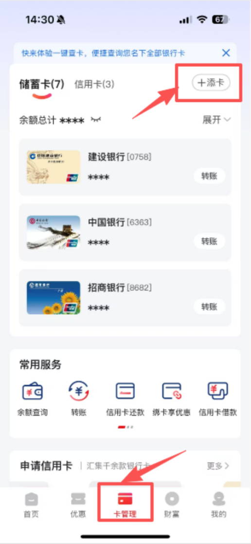 个人消费者下载并注册云闪付APP,绑定一张个人正常使用的银联卡(一类户)。选择下方“卡管理”—“添卡”,可通过“免输卡号,一键绑卡”或输入卡号绑卡方式绑定银联卡。