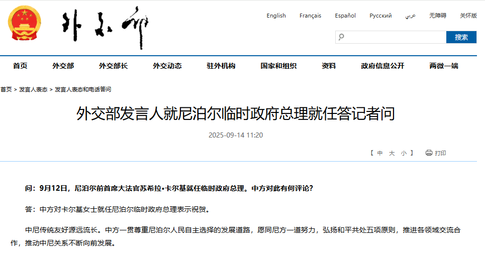 问:9月12日,尼泊尔前首席大法官苏希拉·卡尔基就任临时政府总理。中方对此有何评论?