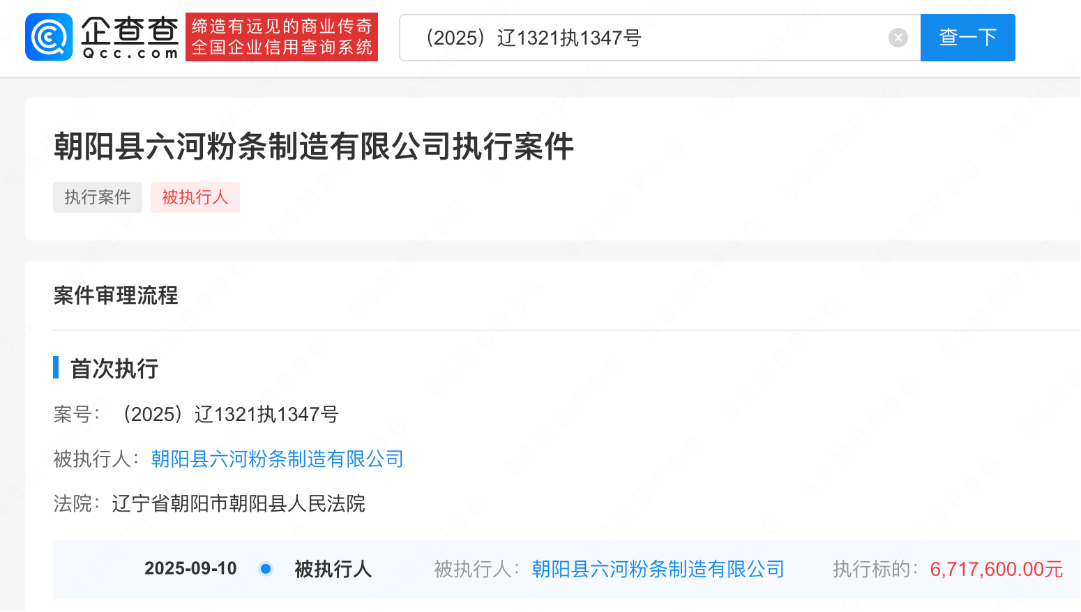 企查查APP显示,近日,朝阳县六河粉条制造有限公司新增一则被执行信息,执行标的671.76万余元,执行法院为辽宁省朝阳市朝阳县人民法院。信息显示,该公司成立于2014年2月,法定代表人为王悦国,注册资本3万元。