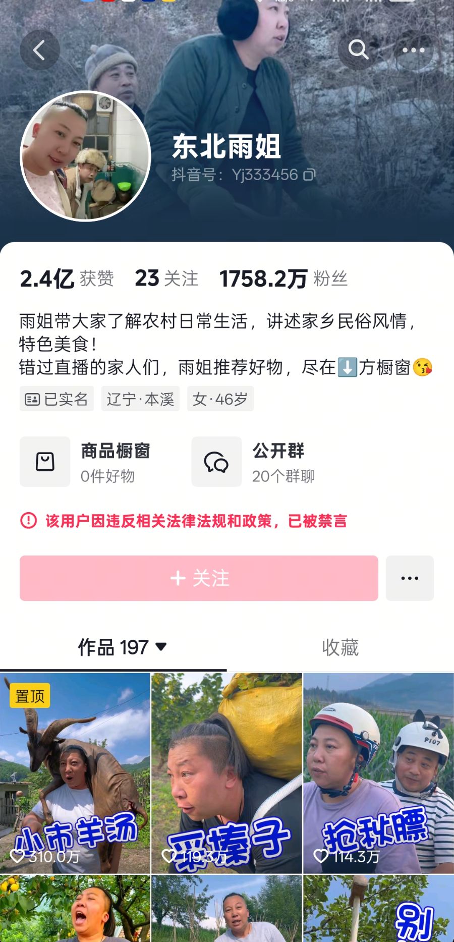 除了带货被处罚,“东北雨姐”还曾涉嫌引起争议的拘禁打人事件。截至发稿,“东北雨姐”的多个社交账号仍显示“该用户违反相关法律规定”,已被禁言。