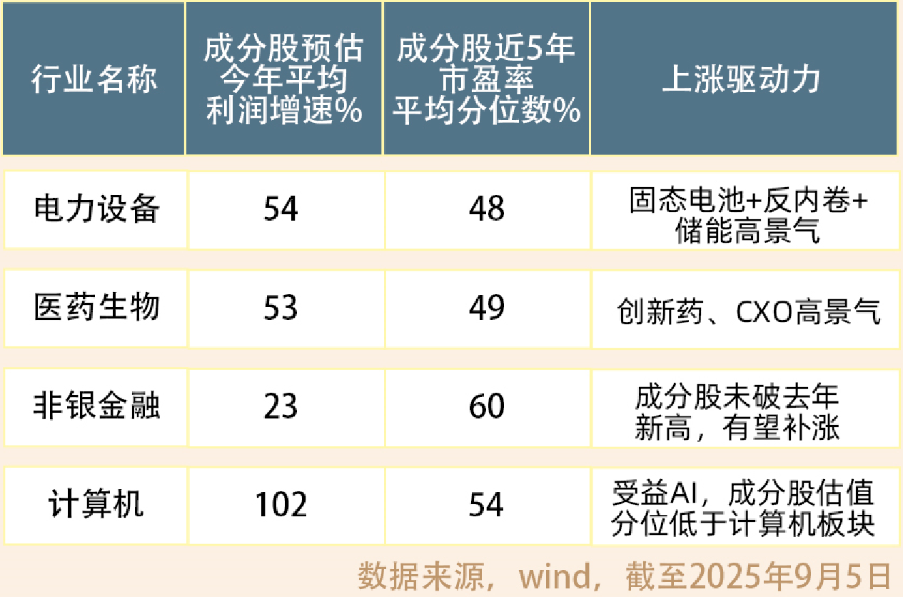 Wind数据显示,截至9月5日,6月23日以来,创业板指中电力设备、通信两个行业对涨幅贡献度最高,均达到32%。电力设备受益于反内卷政策、固态电池利好等,通信成分股包含“易中天”等明星个股,电子上涨贡献度也达到13%。上述三大行业对创业板指本轮涨幅贡献度达78%。