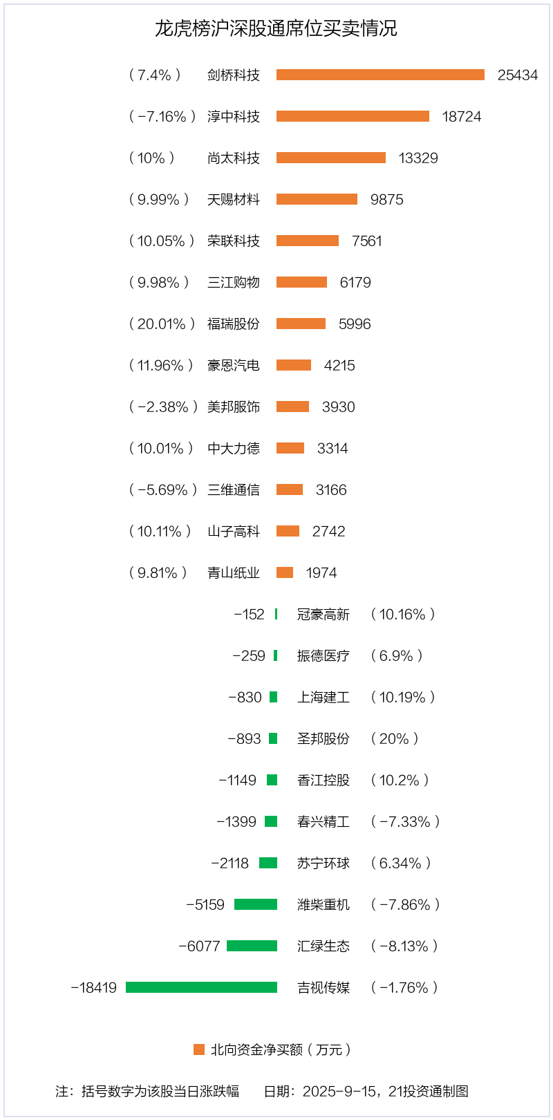 9月15日,北向资金参与龙虎榜中的个股共有23只,合计净买入7亿元。其中沪股通净买入4 股,净卖出5 股,合计净买入3.15亿元;深股通净买入9 股,净卖出5 股,合计净买入3.85亿元。