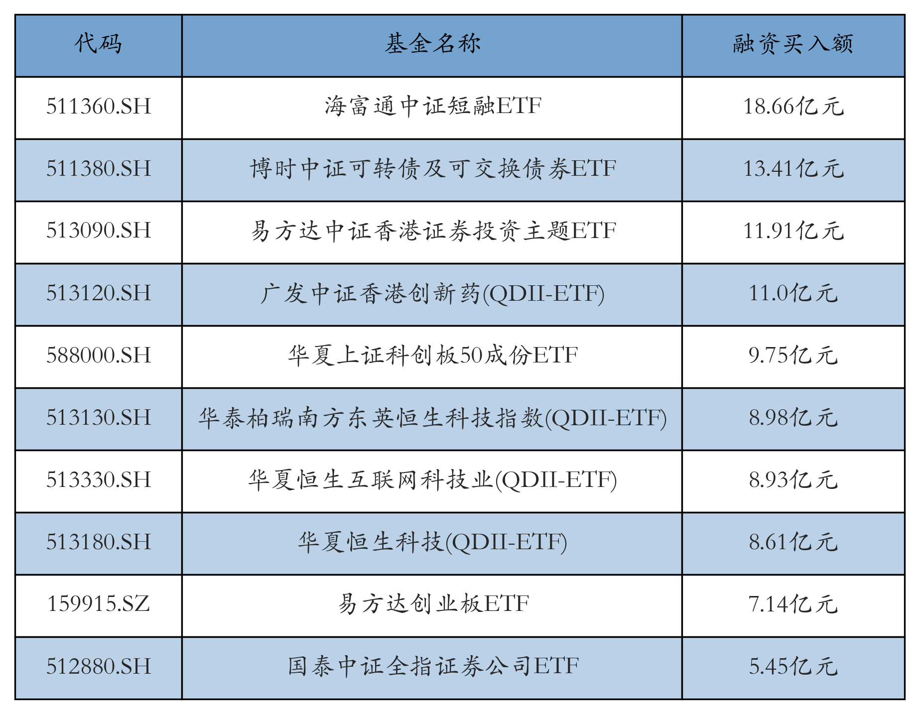 9月12日ETF融资买入额前三位分别为:海富通中证短融ETF(18.66亿元)、博时中证可转债及可交换债券ETF(13.41亿元)和易方达中证香港证券投资主题ETF(11.91亿元),前10具体见下表: