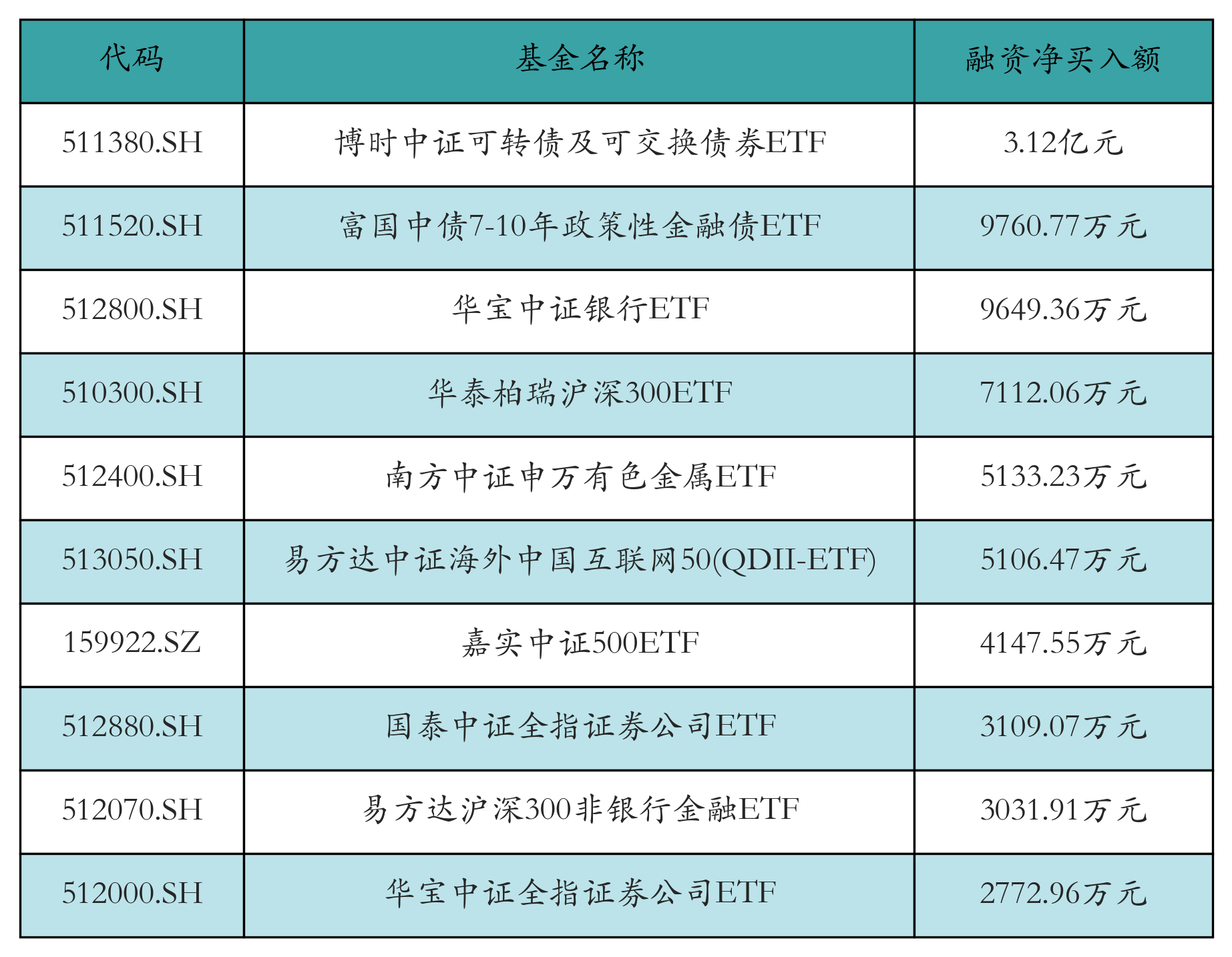 9月12日ETF融资净买入额前三位分别为:博时中证可转债及可交换债券ETF(3.12亿元)、富国中债7-10年政策性金融债ETF(9760.77万元)和华宝中证银行ETF(9649.36万元),前10具体见下表: