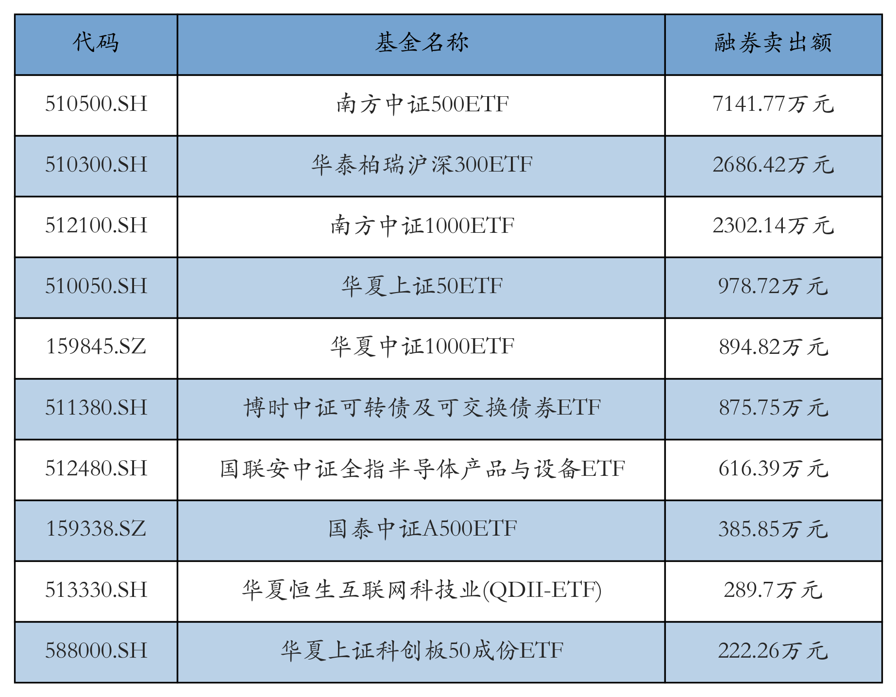 9月12日ETF融券卖出额前三位分别为:南方中证500ETF(7141.77万元)、华泰柏瑞沪深300ETF(2686.42万元)和南方中证1000ETF(2302.14万元),前10具体见下表: