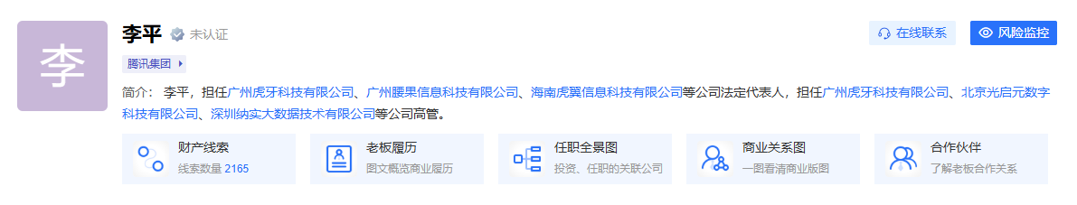 虎牙新法定代表人李平同样与腾讯有着千丝万缕的联系。企查查平台显示,除了虎牙的法定代表人和董事,其还在北京光启元数字科技有限公司、深圳纳实大数据技术有限公司等公司担任高管,而这两家公司的背后都是腾讯。北京光启元数字科技有限公司由深圳市腾讯计算机系统有限公司和林芝腾讯投资管理有限公司共同持股,持股比例分别为80.63048%、19.36952%;深圳纳实大数据技术有限公司则由深圳市腾讯产业创投有限公司100%控股。
